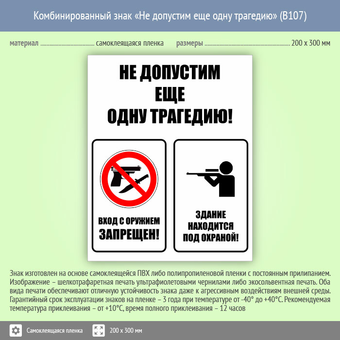 Знак (табличка) «Не допустим еще одну трагедию» имеет размер(ы): 200х300 мм, 300х400 мм, 400х600 мм, но может быть изготовлен(а) любого размера на самоклеящейся пленке, пластике толщиной 0.5, 2 или 4 мм и металле. Также возможно применение фотолюминесцентных и световозвращающих материалов