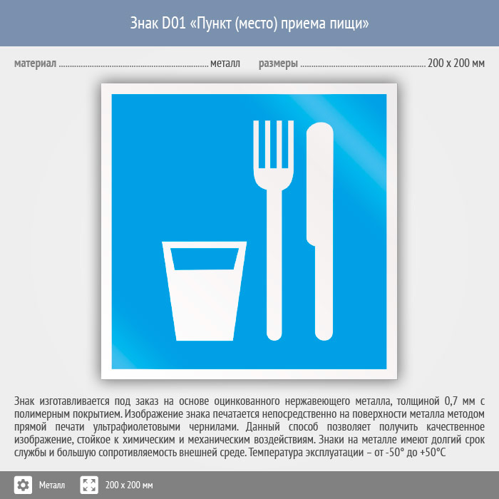 Знак D01 «Пункт (место) приема пищи» (металл, 200х200 мм) в Ожерелье купить