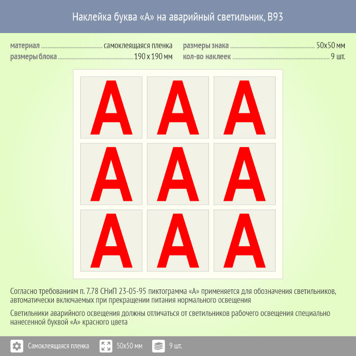 Наклейка буква «А» на аварийный светильник, B93 (пленка, 50х50 мм, блок 9 штук, 190х190 мм) в Ожерелье купить