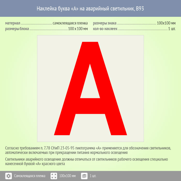 Наклейка буква «А» на аварийный светильник, B93 (пленка, 100х100 мм) в Ожерелье купить
