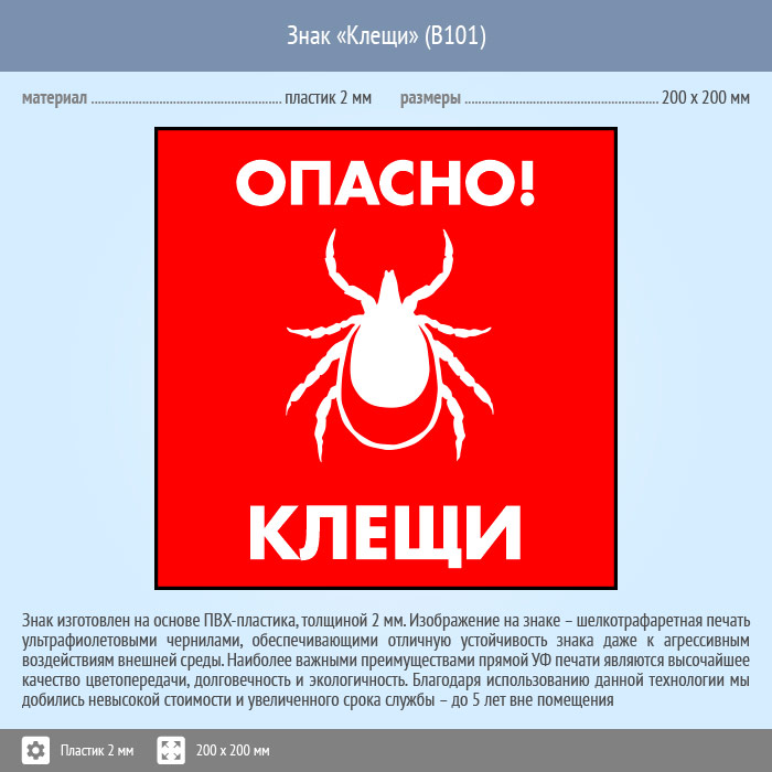 Знак «Опасно! Клещи», B101 (пластик, 200х200 мм) в Ожерелье купить