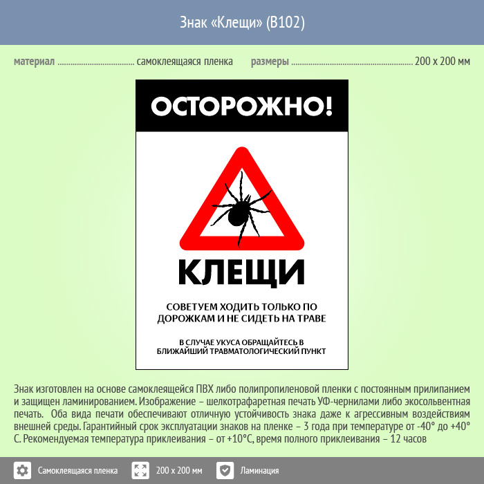 Знак «Осторожно! Клещи», B102 (пленка c ламинированием, 400х600 мм) в Ожерелье купить