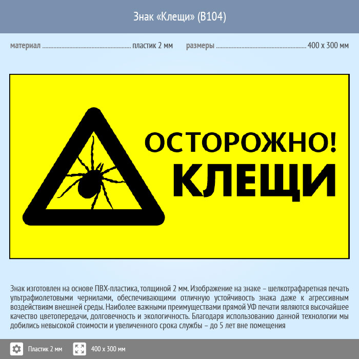 Знак «Осторожно! Клещи», B104 (пластик, 300х200 мм) в Ожерелье купить