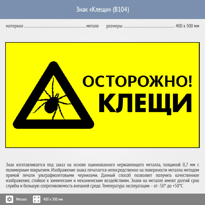 Знак «Осторожно! Клещи», B104 (металл, 300х200 мм) в Ожерелье купить