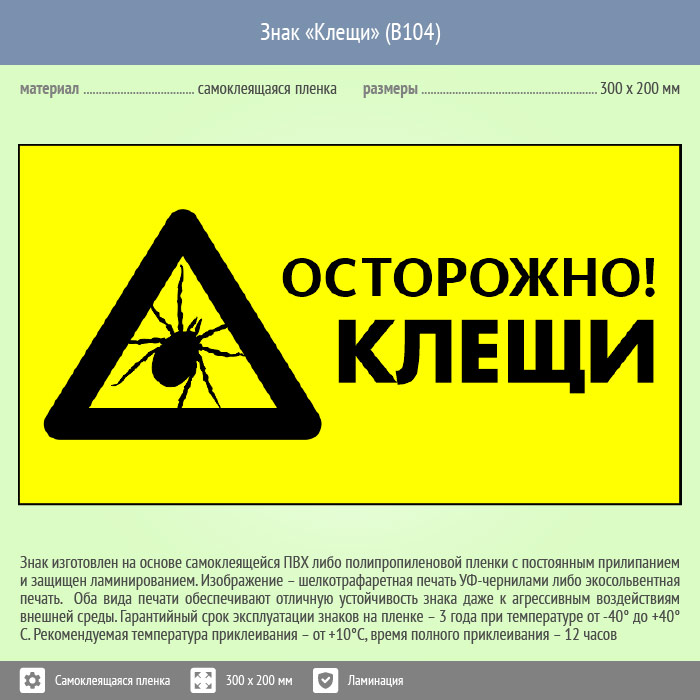 Знак «Осторожно! Клещи», B104 (пленка c ламинированием, 400х300 мм) в Ожерелье купить