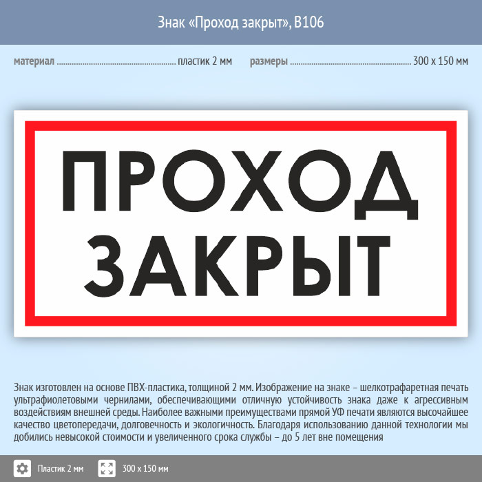 Знак «Проход закрыт», B106 (пластик, 300х150 мм) в Ожерелье купить