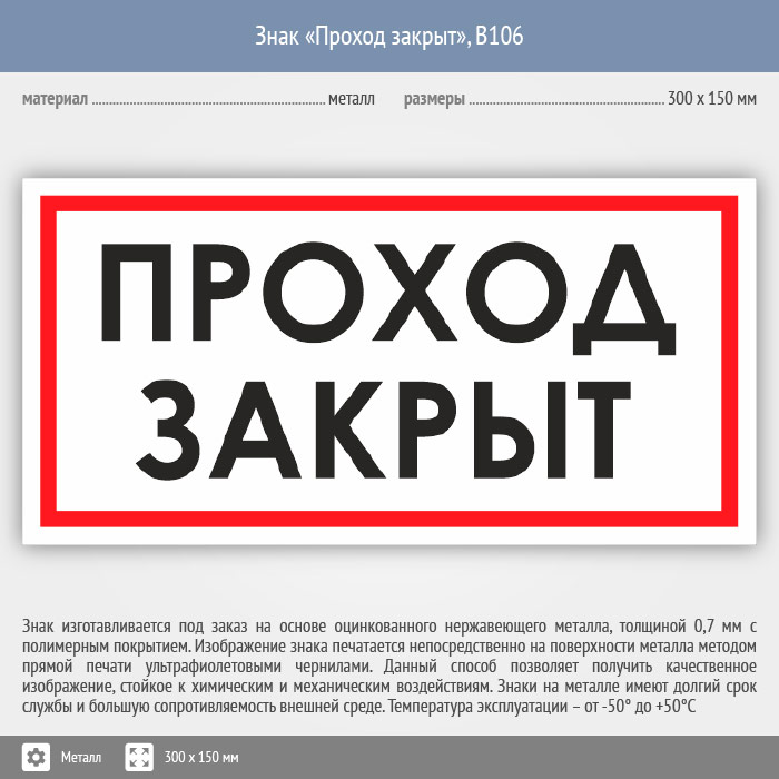 Знак «Проход закрыт», B106 (металл, 300х150 мм) в Ожерелье купить