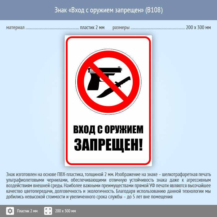 Знак «Вход с оружием запрещен», B108 (пластик, 200х300 мм) в Ожерелье купить