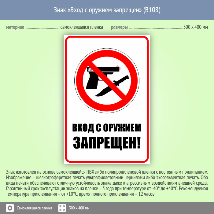 Знак «Вход с оружием запрещен», B108 (пленка, 300х400 мм) в Ожерелье купить