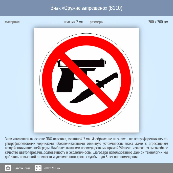 Знак «Оружие запрещено», B110 (пластик, 200х200 мм) в Ожерелье купить
