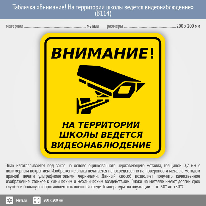 Табличка «Внимание! На территории школы ведется видеонаблюдение», B114 (металл, 200х200 мм) в Ожерелье купить