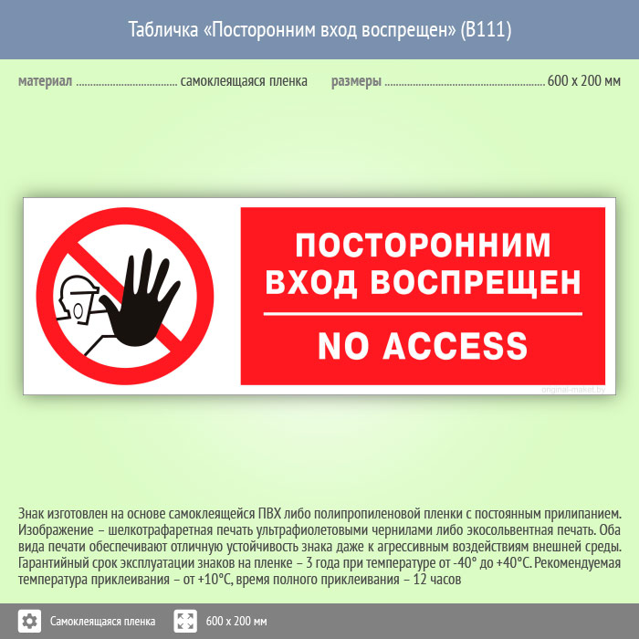 Табличка «Посторонним вход воспрещен», B111 (пленка, 600х200 мм) в Ожерелье купить