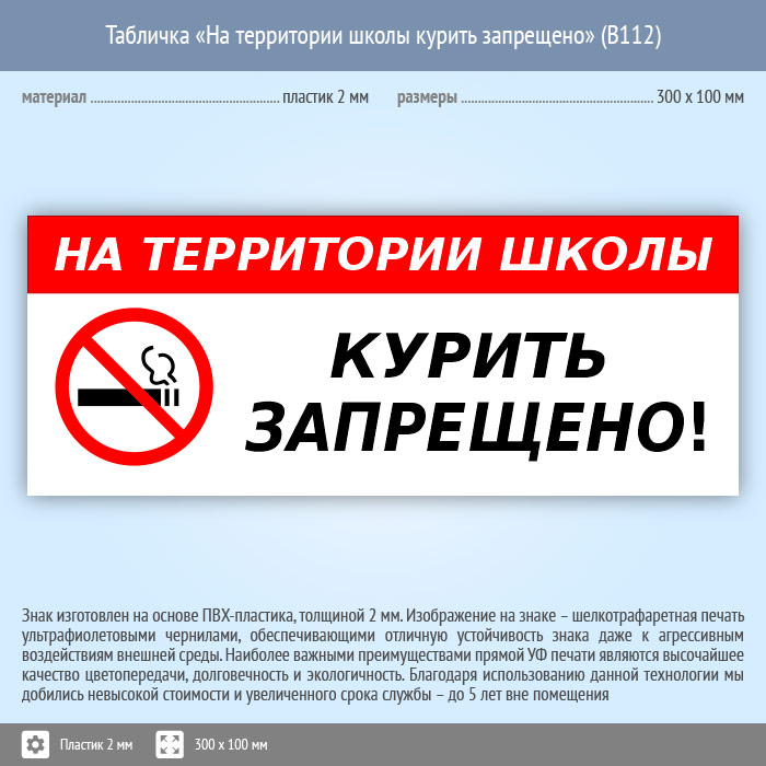 Табличка «На территории школы курить запрещено», B112 (пластик, 300х100 мм) в Ожерелье купить