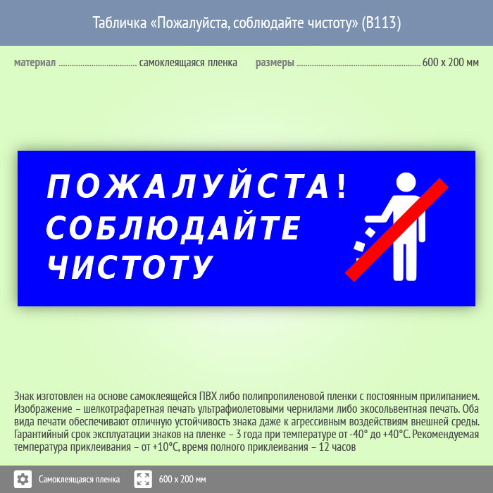 Табличка «Пожалуйста, соблюдайте чистоту», B113 (пленка, 600х200 мм) в Ожерелье купить