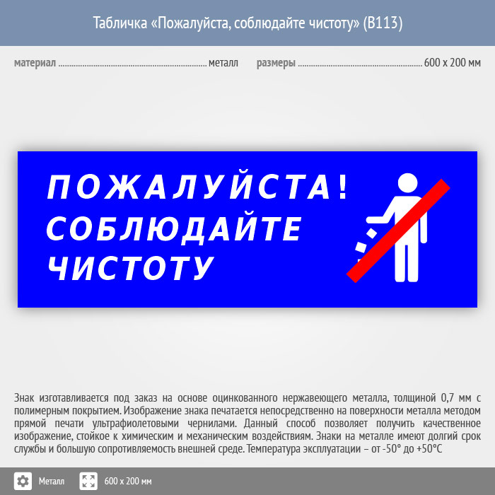 Табличка «Пожалуйста, соблюдайте чистоту», B113 (металл, 600х200 мм) в Ожерелье купить
