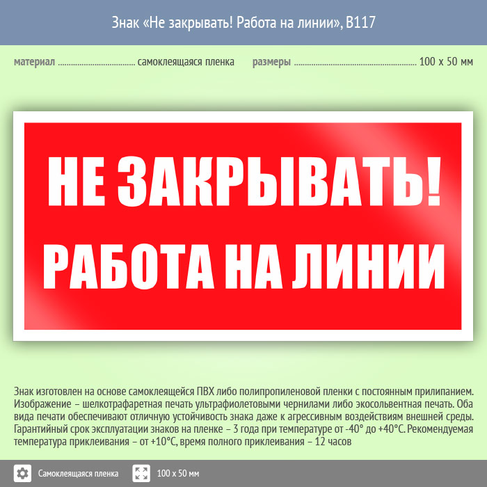 Знак «Не закрывать! Работа на линии», B117 (пленка, 100х50 мм) в Ожерелье купить