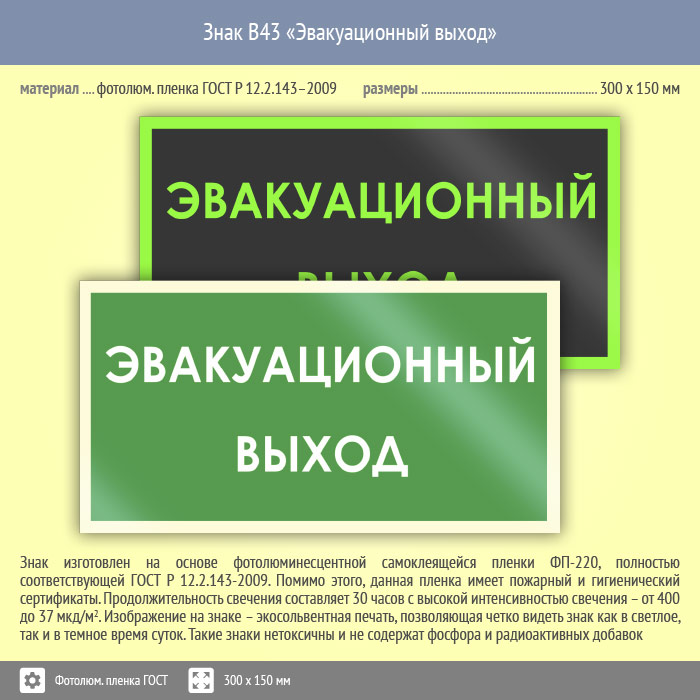 Знак B43 «Эвакуационный выход» (фотолюминесцентная пленка ГОСТ 34428-2018, 300х150 мм) в Ожерелье купить