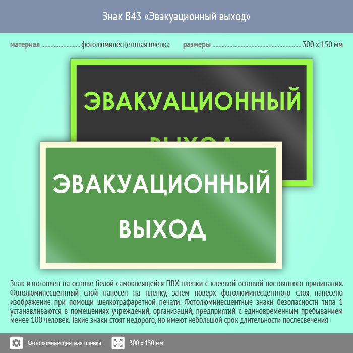 Знак B43 «Эвакуационный выход» (фотолюминесцентная пленка, 300х150 мм) в Ожерелье купить