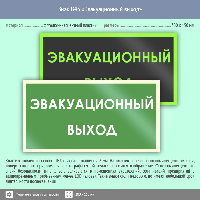 Знак B43 «Эвакуационный выход» (фотолюминесцентный пластик, 300х150 мм) в Ожерелье купить