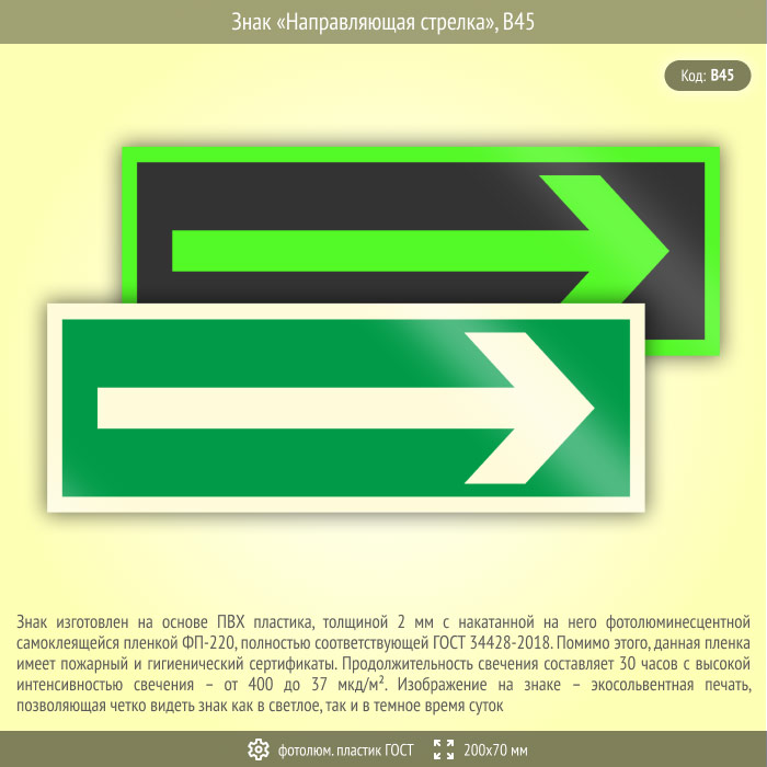 Знак «Направляющая стрелка», B45 (фотолюминесцентный пластик ГОСТ 34428-2018, 200х70 мм) в Ожерелье купить