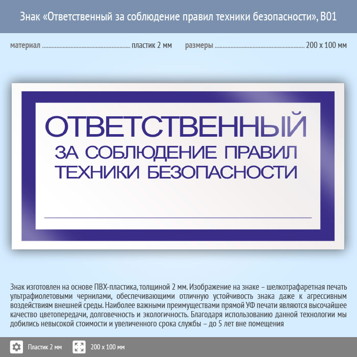 Знак «Ответственный за соблюдение правил техники безопасности», B01 (пластик, 200х100 мм) в Ожерелье купить