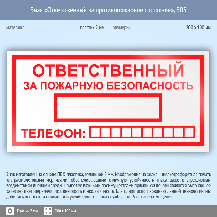 Знак «Ответственный за пожарную безопасность», B03 (пластик, 200х100 мм) в Ожерелье купить