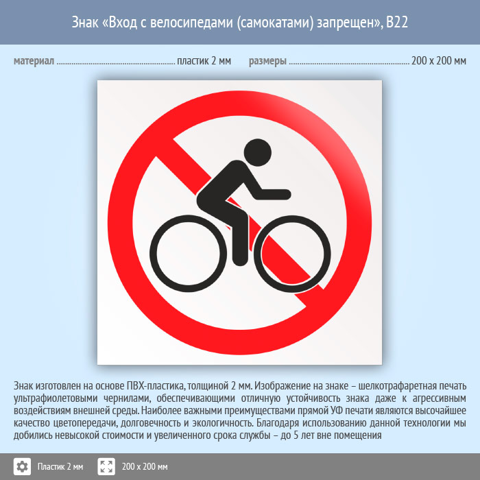 Знак «Вход с велосипедами (самокатами) запрещен», B22 (пластик, 200х200 мм) в Ожерелье купить