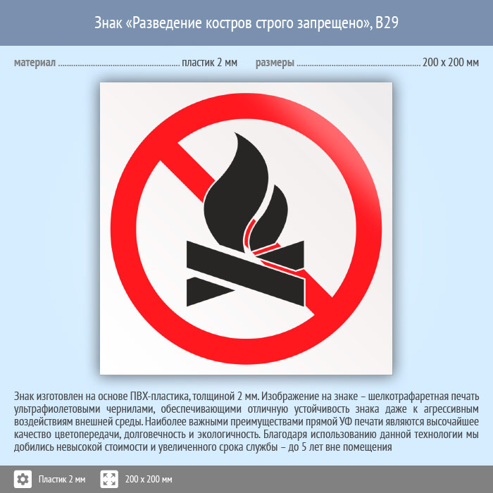 Знак «Разведение костров строго запрещено», B29 (пластик, 200х200 мм) в Ожерелье купить