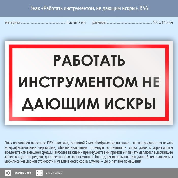 Знак «Работать инструментом, не дающим искры», B56 (пластик, 300х150 мм) в Ожерелье купить