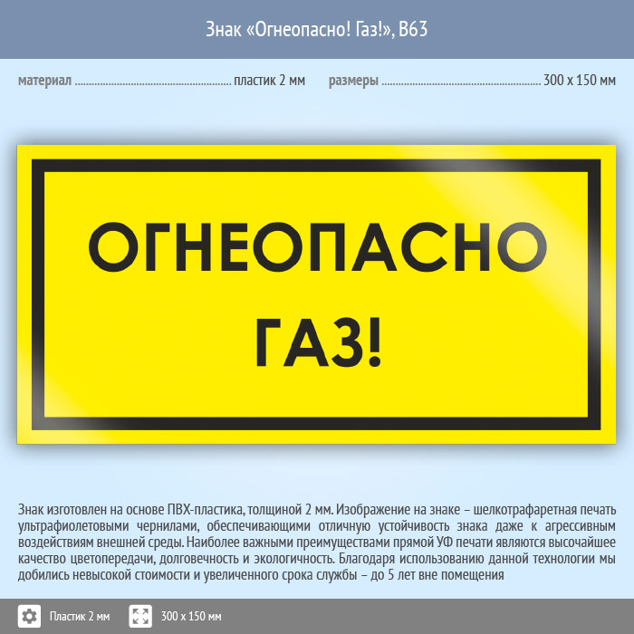 Знак «Огнеопасно! Газ!», B63 (пластик, 300х150 мм) в Ожерелье купить