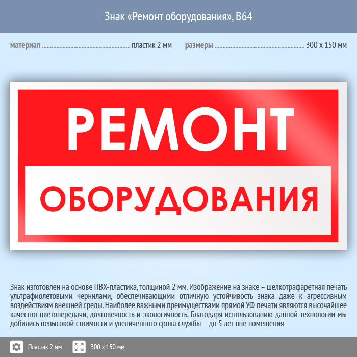 Знак «Ремонт оборудования», B64 (пластик, 300х150 мм) в Ожерелье купить