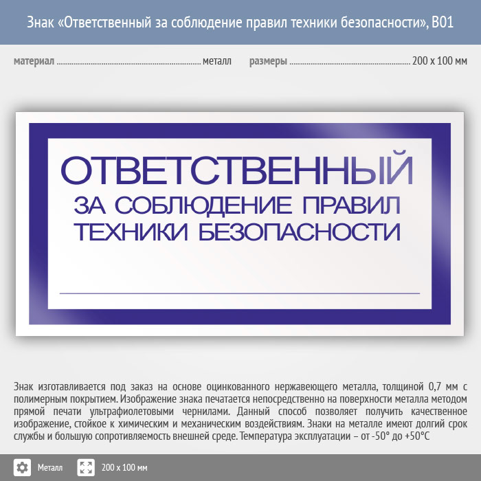 Знак «Ответственный за соблюдение правил техники безопасности», B01 (металл, 200х100 мм) в Ожерелье купить
