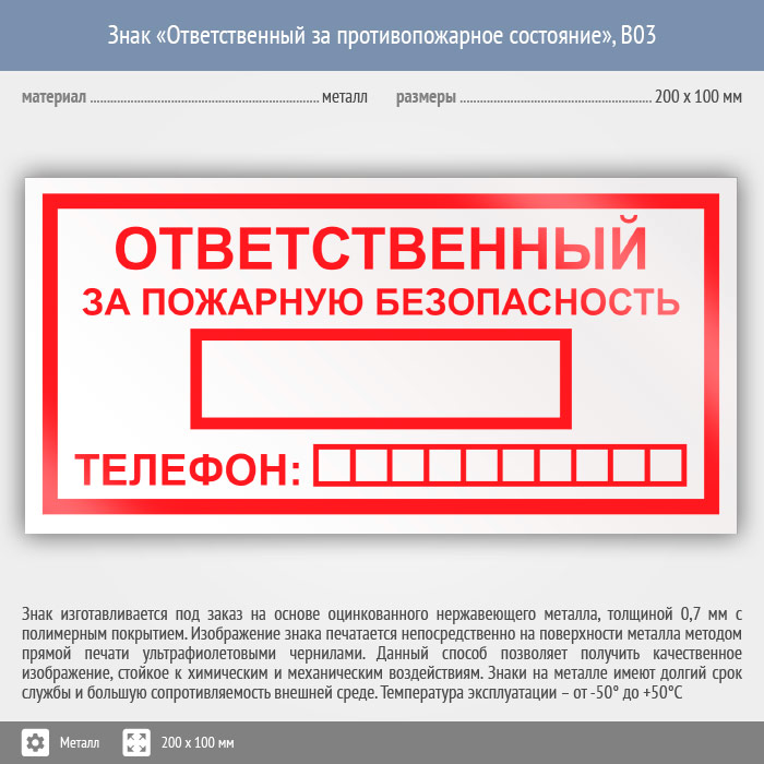 Знак «Ответственный за пожарную безопасность», B03 (металл, 200х100 мм) в Ожерелье купить