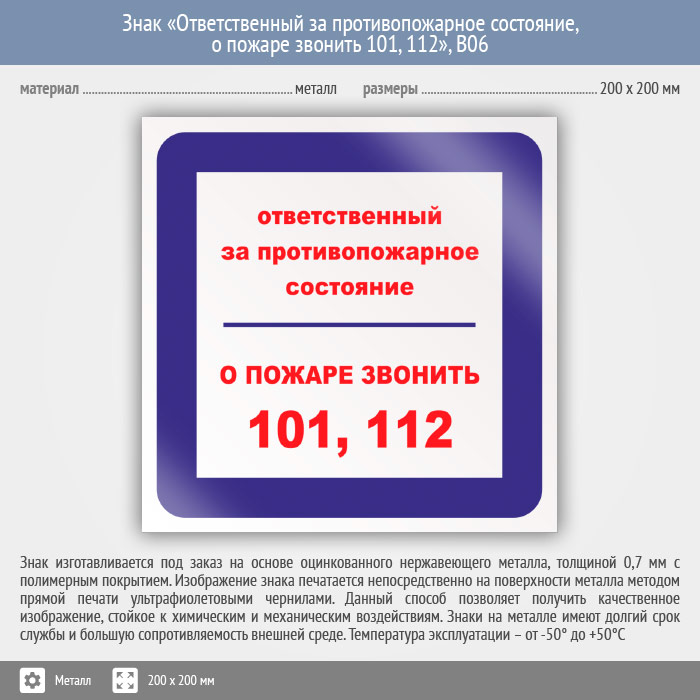 Знак «Ответственный за противопожарное состояние, о пожаре звонить 101, 112», B06 (металл, 200х200 мм) в Ожерелье купить
