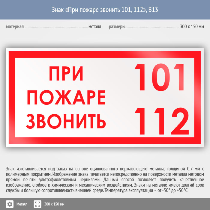 Знак «При пожаре звонить 101, 112», B13 (металл, 300х150 мм) в Ожерелье купить