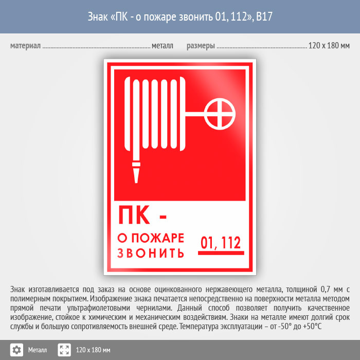 Знак «ПК - о пожаре звонить 01, 112», B17 (металл, 120х180 мм) в Ожерелье купить