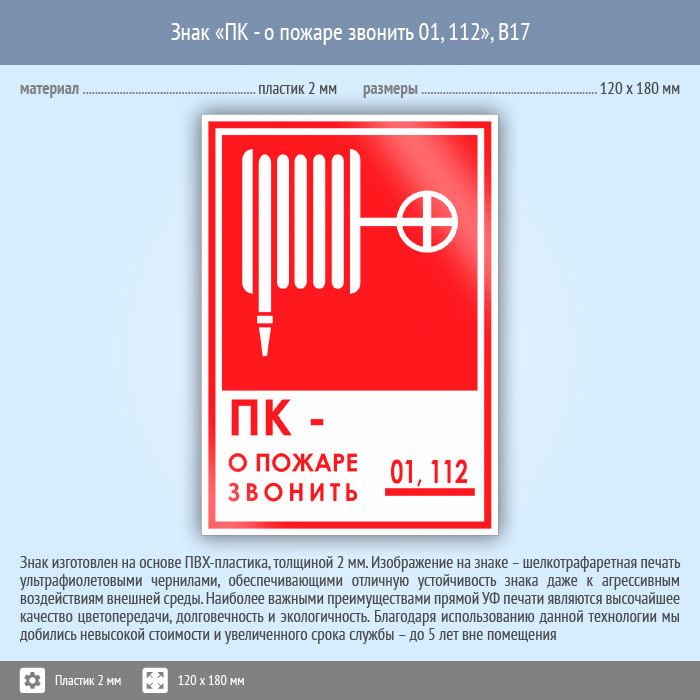 Знак «ПК - о пожаре звонить 01, 112», B17 (пластик, 120х180 мм) в Ожерелье купить