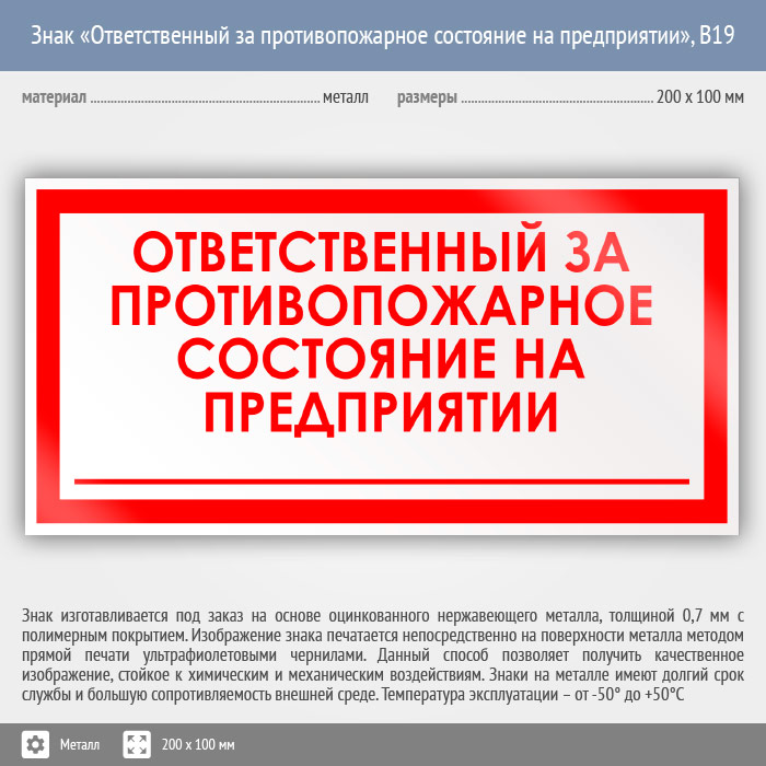 Знак «Ответственный за противопожарное состояние на предприятии», B19 (металл, 200х100 мм) в Ожерелье купить