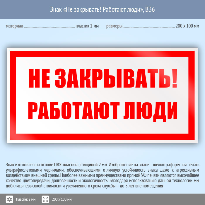 Знак «Не закрывать! Работают люди», B36 (пластик, 200х100 мм) в Ожерелье купить
