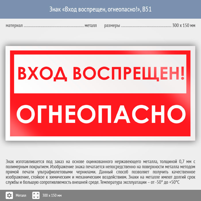Знак «Вход воспрещен, огнеопасно!», B51 (металл, 300х150 мм) в Ожерелье купить