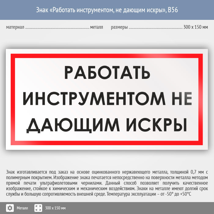 Знак «Работать инструментом, не дающим искры», B56 (металл, 300х150 мм) в Ожерелье купить