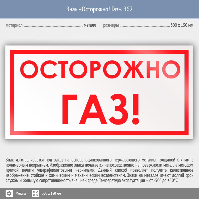 Знак «Осторожно! Газ», B62 (металл, 300х150 мм) в Ожерелье купить