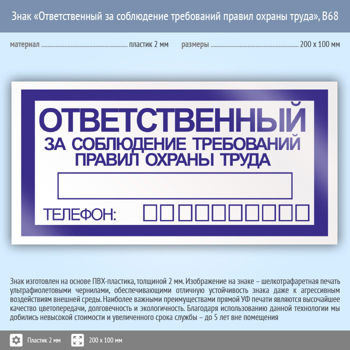 Знак «Ответственный за соблюдение требований правил охраны труда», B68 (пластик, 200х100 мм) в Ожерелье купить