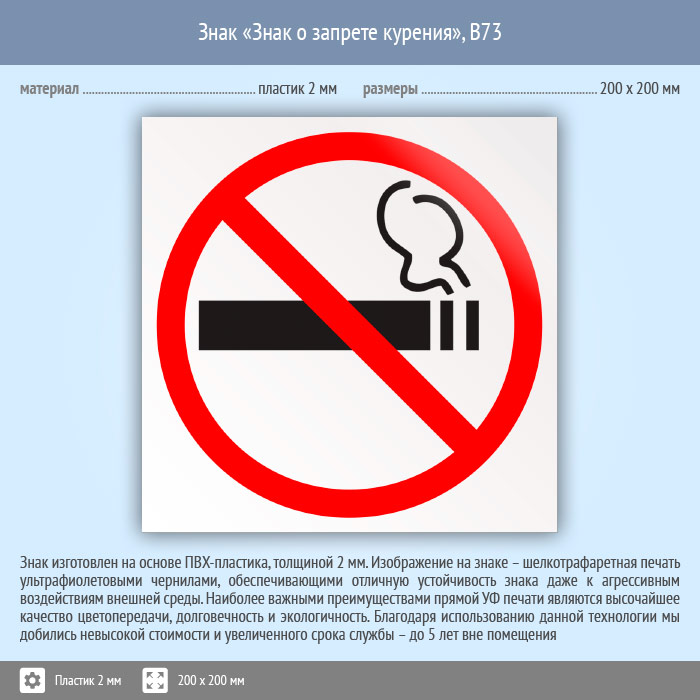 Знак «Знак о запрете курения», B73 (пластик, 200х200 мм) в Ожерелье купить