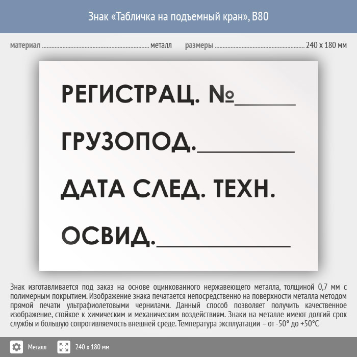 Знак «Табличка на подъемный кран», B80 (металл, 240х180 мм) в Ожерелье купить