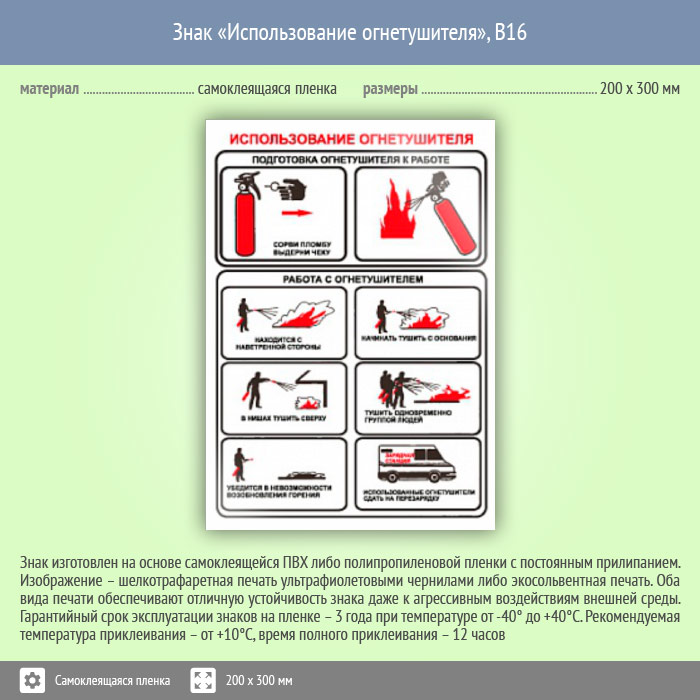 Знак «Использование огнетушителя» может быть изготовлен любого размера на самоклеящейся пленке, пластике толщиной 0.5, 2 или 4 мм и металле. Также возможно применение фотолюминесцентных и световозвращающих материалов