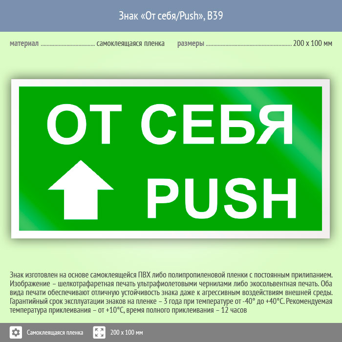 Знак «От себя/Push» может быть изготовлен любого размера на самоклеящейся пленке, пластике толщиной 0.5, 2 или 4 мм и металле. Также возможно применение фотолюминесцентных и световозвращающих материалов