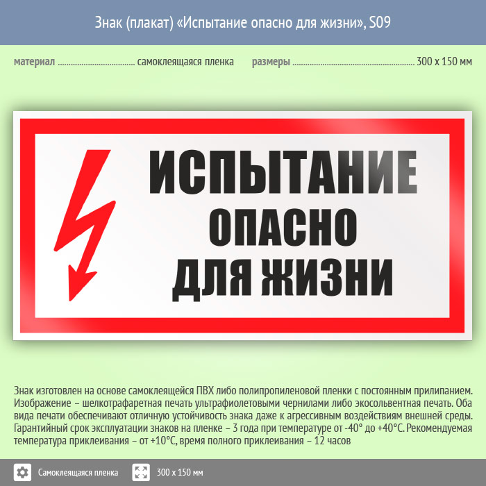 Знак «Испытание опасно для жизни» может быть изготовлен любого размера на самоклеящейся пленке, пластике толщиной 0.5, 2 или 4 мм и металле. Также возможно применение фотолюминесцентных и световозвращающих материалов