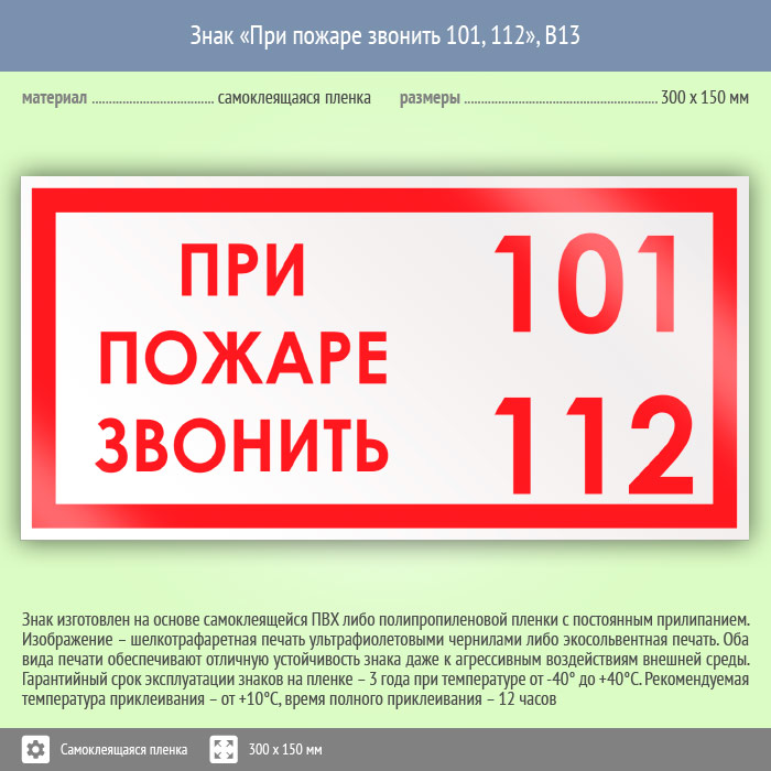 Знак «При пожаре звонить 101, 112» может быть изготовлен любого размера на самоклеящейся пленке, пластике толщиной 0.5, 2 или 4 мм и металле. Также возможно применение фотолюминесцентных и световозвращающих материалов