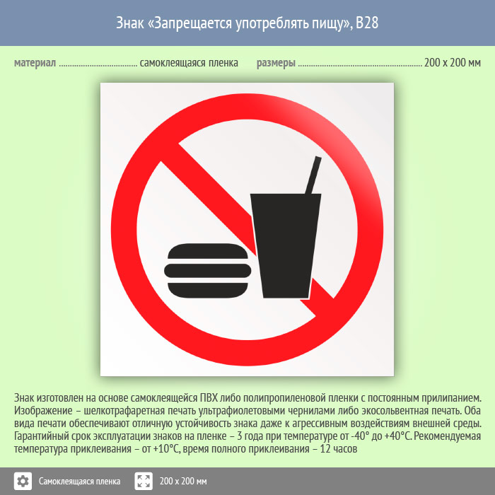 Знак «Запрещается употреблять пищу» может быть изготовлен любого размера на самоклеящейся пленке, пластике толщиной 0.5, 2 или 4 мм и металле. Также возможно применение фотолюминесцентных и световозвращающих материалов